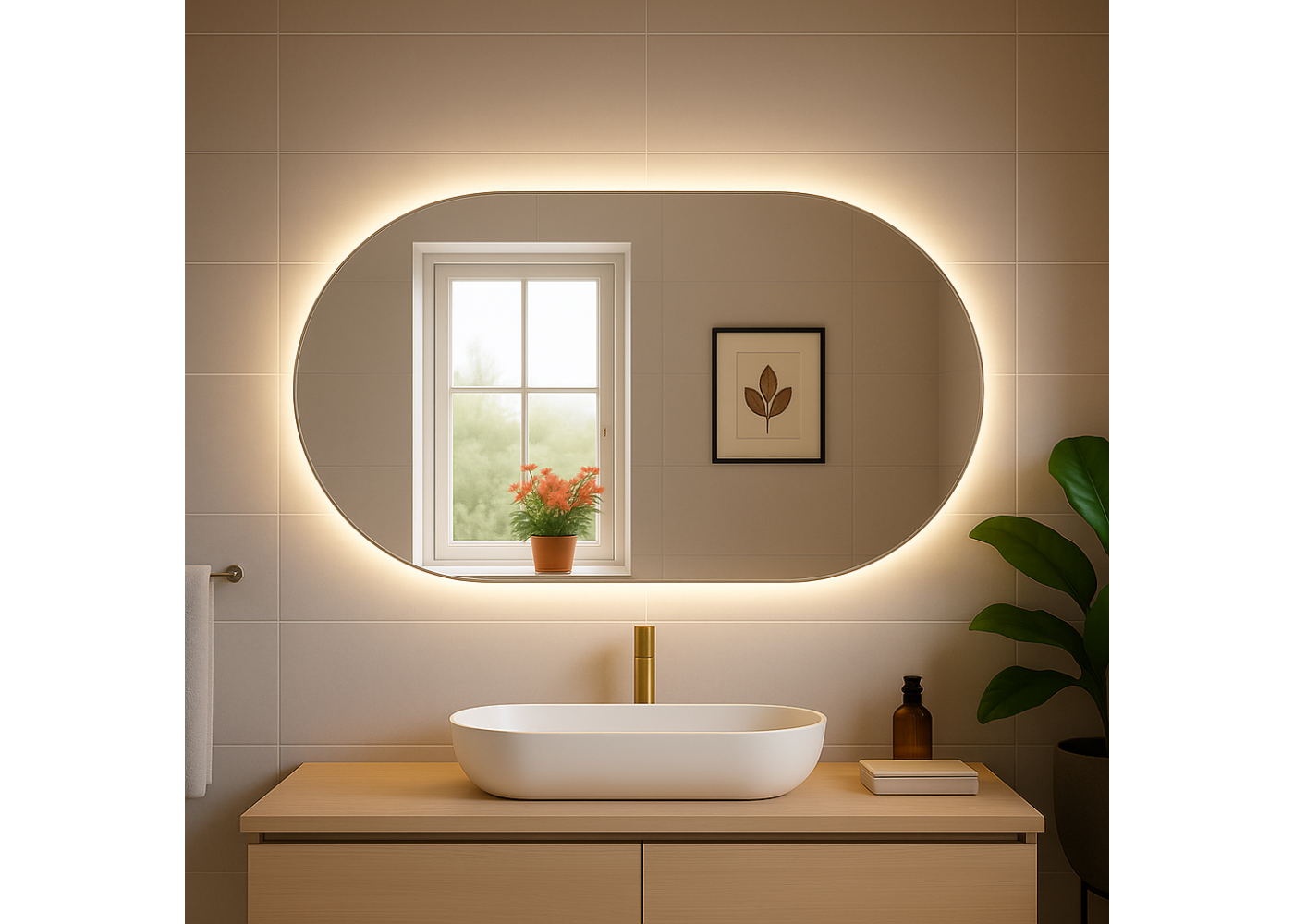 Вишукане овальне дзеркало LumoOval MX розміром 1300x600 мм з LED-підсвіткою – це ідеальне поєднання сучасного дизайну, функціональності та преміальної якості. Створене спеціально для ванних кімнат, де важлива кожна деталь, це дзеркало стане стильним і практичним елементом інтер'єру.